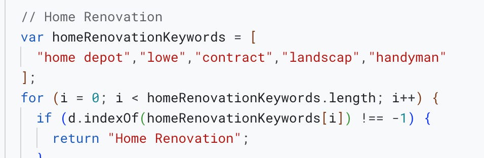 Once I settled on using Google Sheets and Apps Script, I went deep into creating my transaction categorization logic.